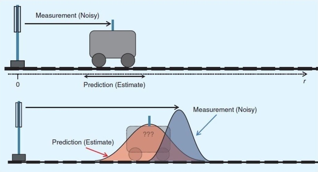 由于自身的原因,它的位置并不是由匀速运动公式得到的精确位置,它的距离传感器数据也不完全准确。两者都有一定的误差。那么我们现在如何估计汽车的实际位置呢?